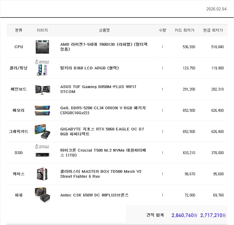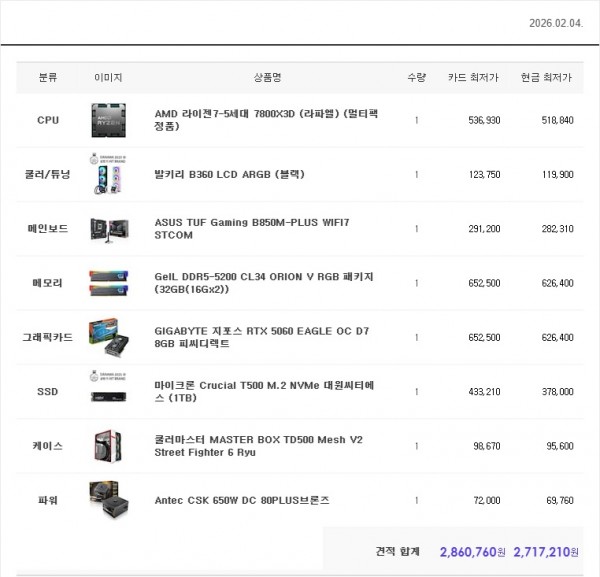 2026년 2월 290만원후반대 amd 7800x3d 견적입니다