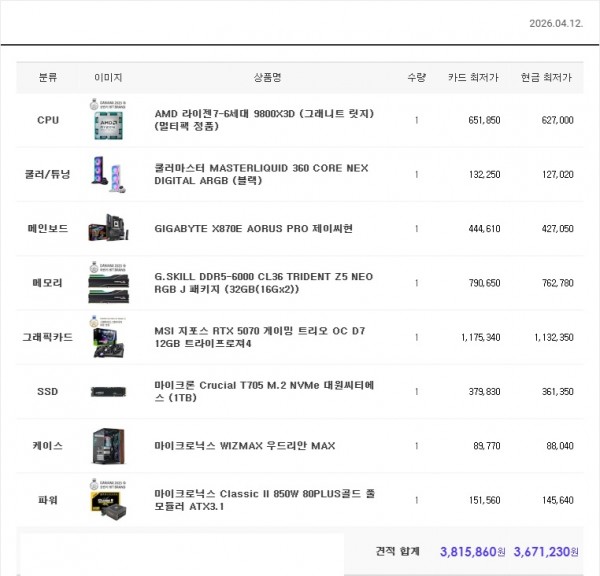 2026년4월 382만원대 믕 9800x3d/32기가/ssd 1테라/rtx5070/수냉