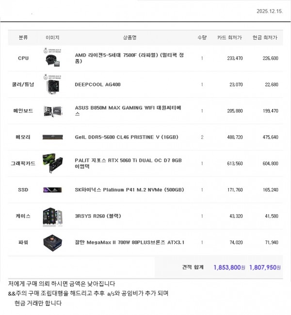 2025 12월 AMD 게임pc 186만원대 견적 (각종 부품 금액 상승으로 인해 많이 올랐어요)