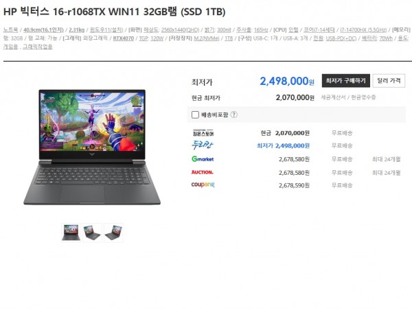 HP 빅터스 16-r1068TX WIN11 32GB램 (SSD 1TB)(i714700hx/RTX4070)