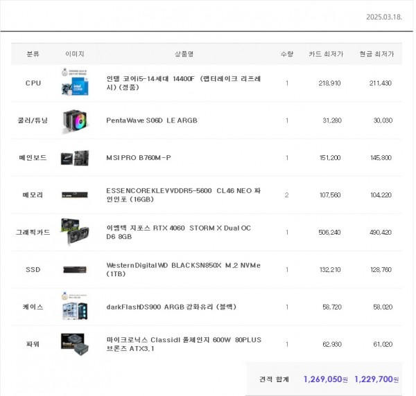 2025년 3월 인텔 127만원대 견적