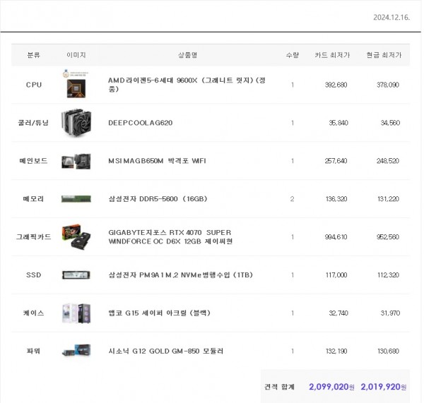 12월16일 209만원대 amd9600+4070슈퍼 209만원 견적입니다(QHD게이밍 모니터용 견적입니다)