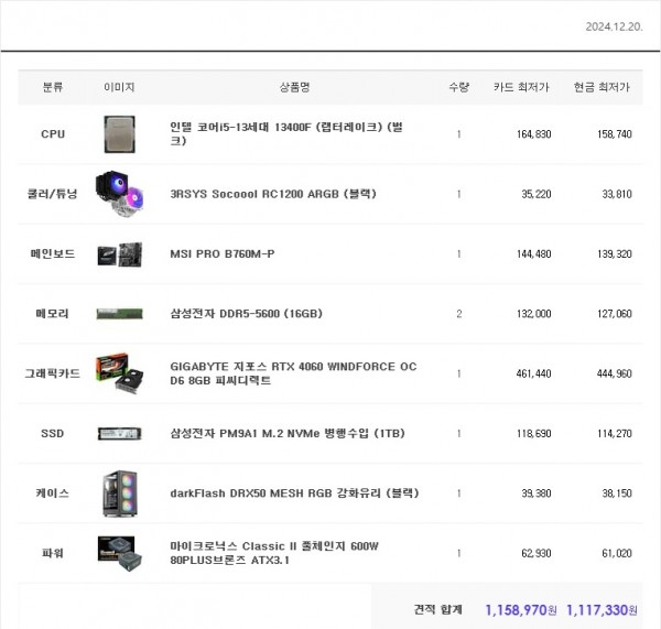 12월 20일 가성비 인텔13세대 i5 116만원대 견적