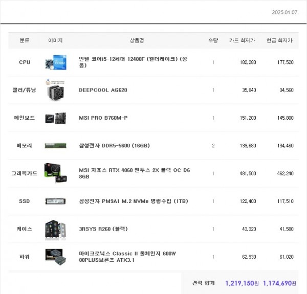 2025년1월 인텔 122만원대 견적입니다