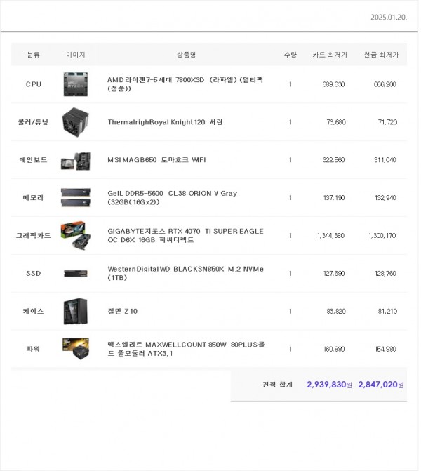 2025년1월20일 294만원대 견적입니다