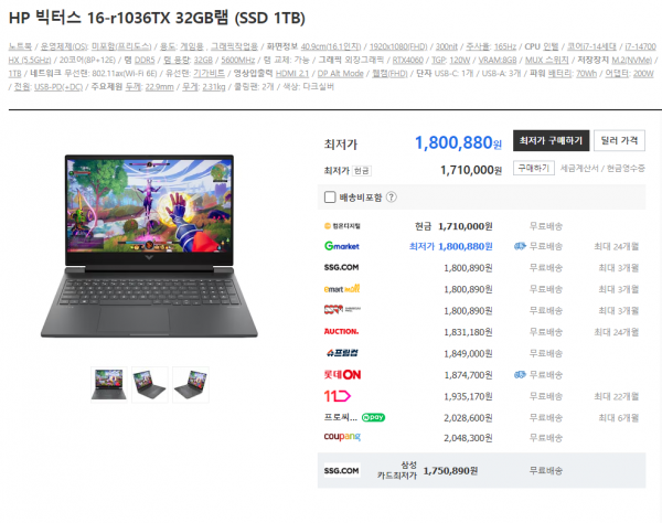 10월 추천 노트북HP 빅터스 16-r1036TX 32GB램 (SSD 1TB)