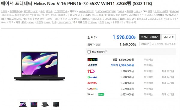 에이서 프레데터 Helios Neo V 16 PHN16-72-55XV WIN11 32GB램 (SSD 1TB) 159만원대 qhd 32기가 1테라ssd 포함 모델