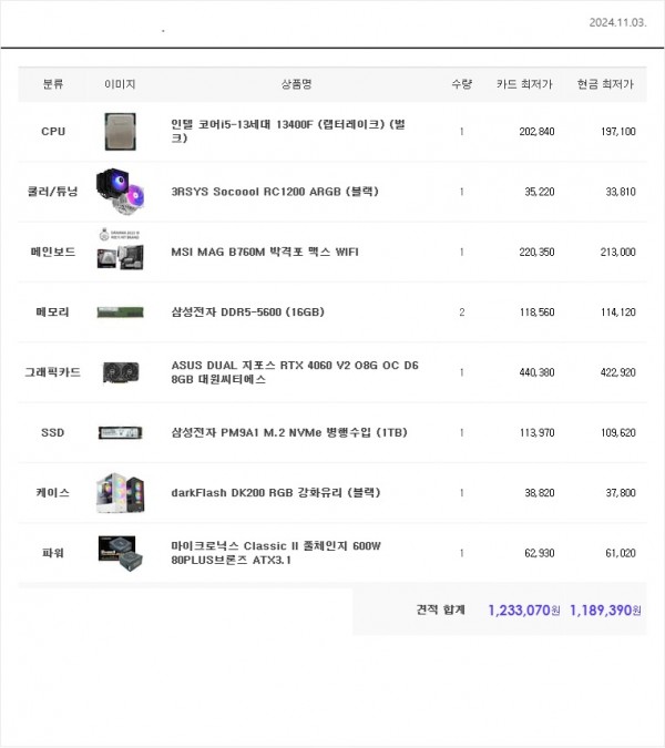11월 123만원대 인텔견적입니다 참조하세요