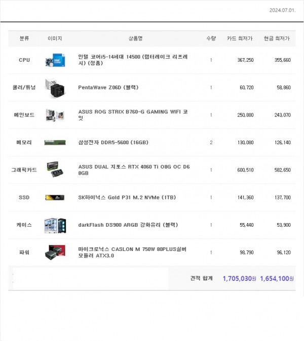 7월 1일 기준 인텔 4060ti 170만원대 견적입니다