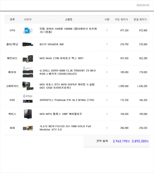 대군님 견적의뢰입니다 290만원대