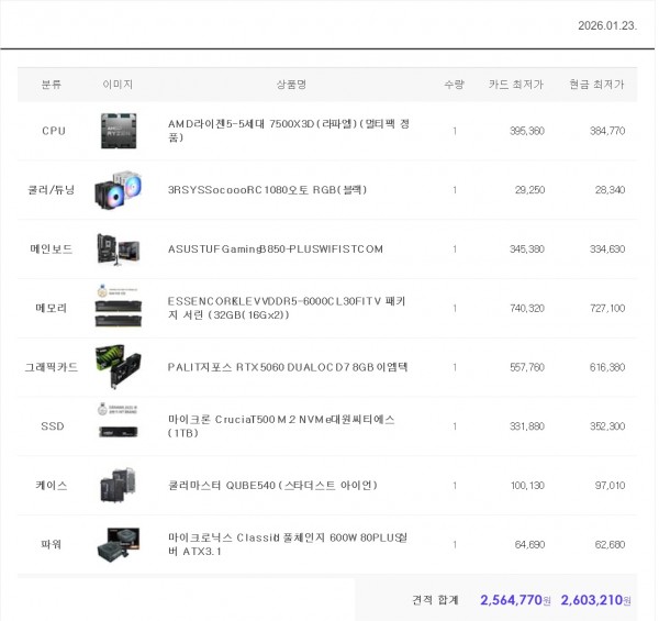 7500x3d 260만원대 견적입니다 2026년 1월